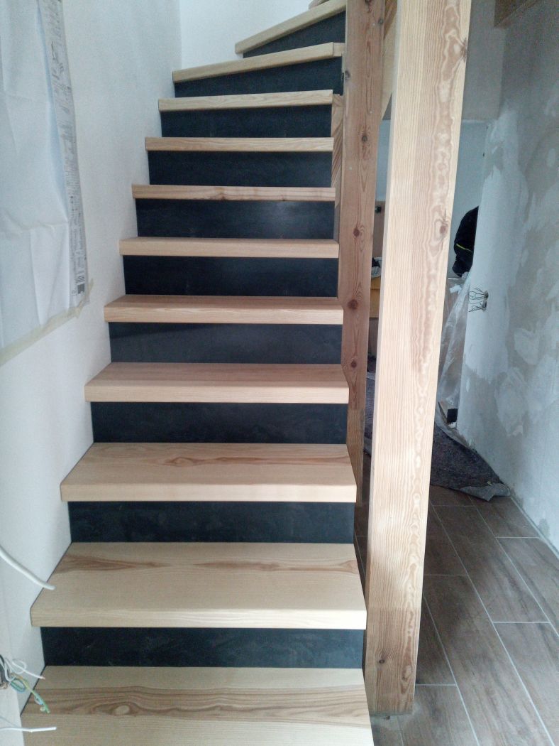 Bei der aufgesattelten Treppe liegen die Stufen auf Tragholmen (Wangen), die Sägezahnförmig (Stufenförmig) ausgeklingt sind, dies ist mit oder ohne Setzstufen möglich. Die Geländerstäbe können auf den Stufen stehen oder mit einem Untergurt befestigt werden.