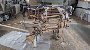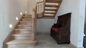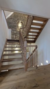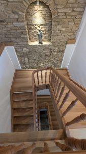 mit und ohne Setzstufen, Zwischenpodeste, Stufen und Wangen in Eichenholz, gedrechselte Pfosten, Stäbe und Handlaufprofiel in Kirchbaumholz, nach Kundenwunsch Natur geölt .